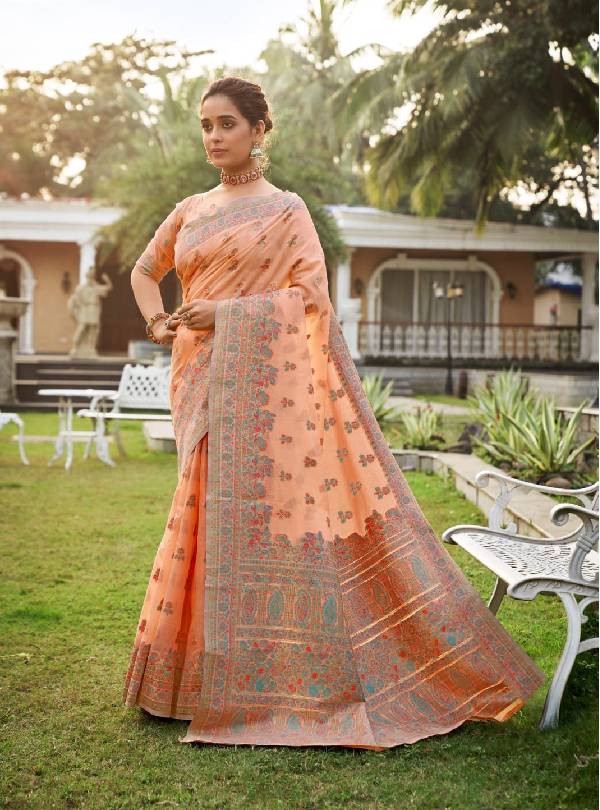 On the fourth day of Navratri, we honor Goddess Kushmanda who signifies the creative power of the universe and the vegetation of the earth. The color of the 4th day is orange which represents the warmth and spirit of life. You can experiment with a satin georgette saree that features a beautiful floral print and blends traditional elegance with modern style. The energetic color patterns catch the energy and spirit of Navratri and make this saree a standout piece for the celebrations.