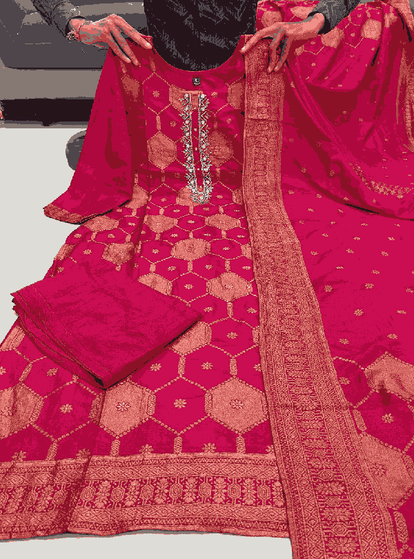 Elevate your ethnic wardrobe with this Banarasi Zari Jacquard Suit Set. Featuring a beautifully woven top, matching pant, and elegant dupatta, it showcases intricate handwoven jacquard patterns and delicate zari work. Perfect for festive occasions, weddings, and special events.