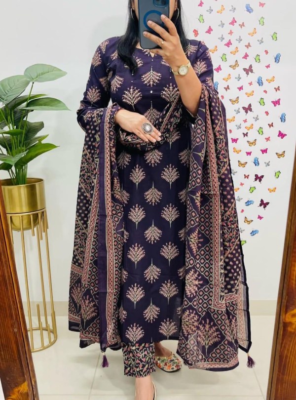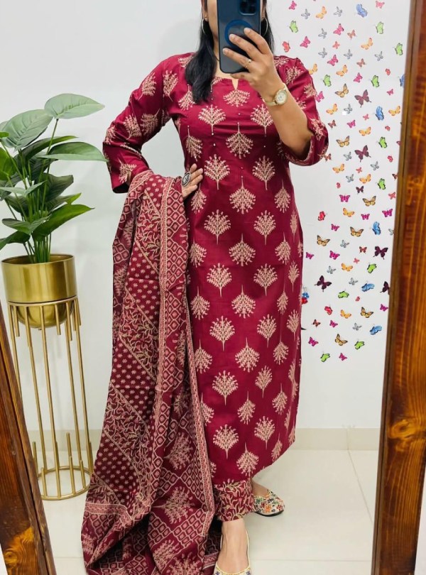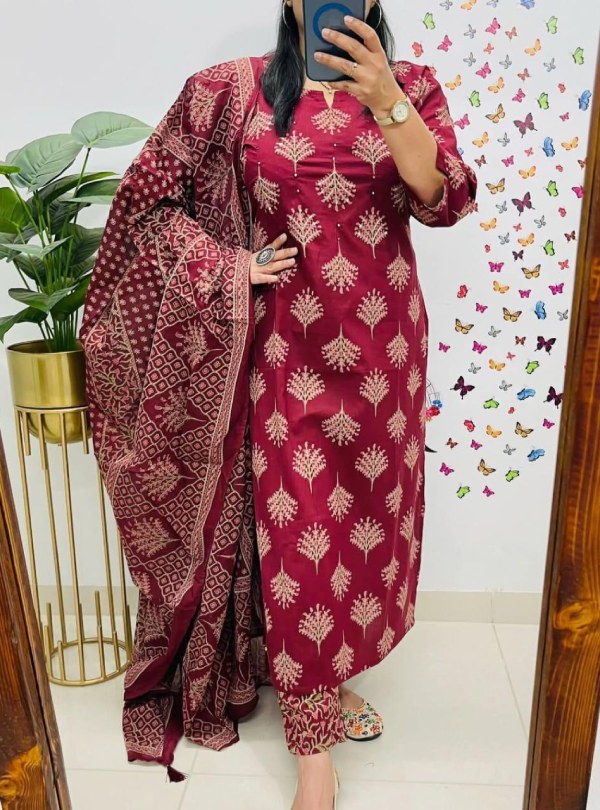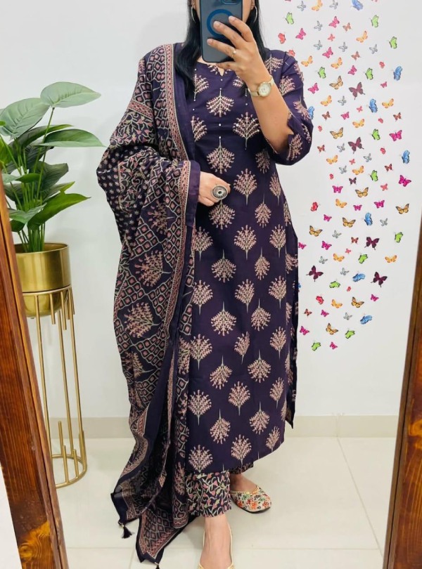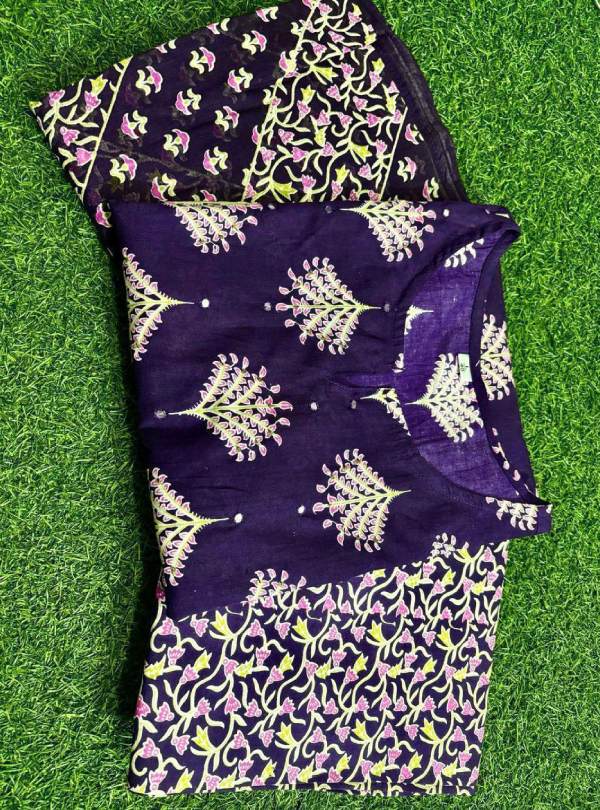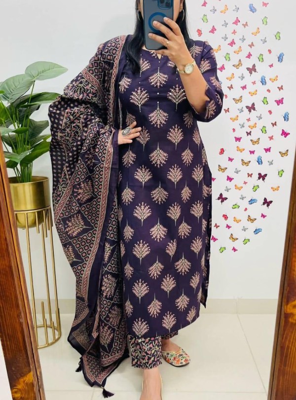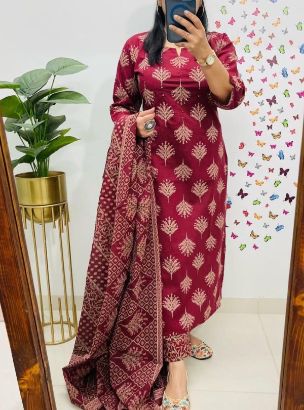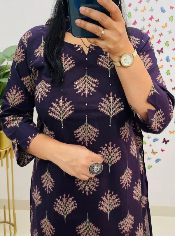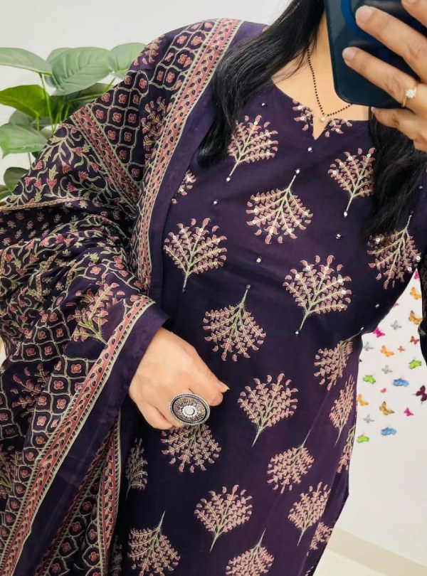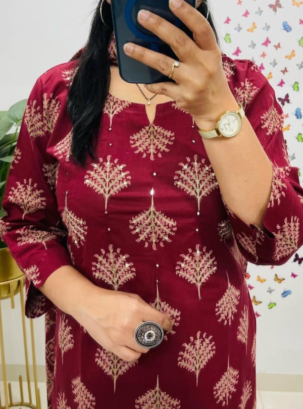 Stay effortlessly graceful with our pure fine cotton kurti set, paired with matching pants and a 100×100 cotton dupatta. Highlighted by heavy sequin hand Adda work on the yoke, this set blends traditional artistry with everyday elegance—perfect for festive gatherings or special occasions.
