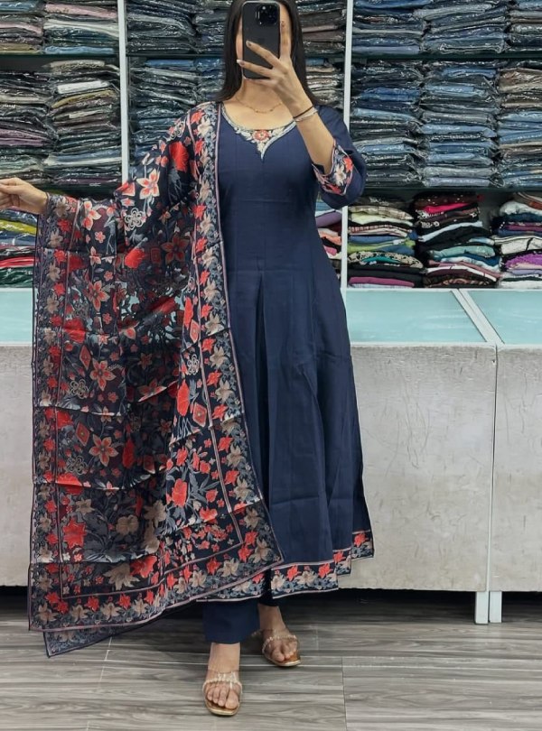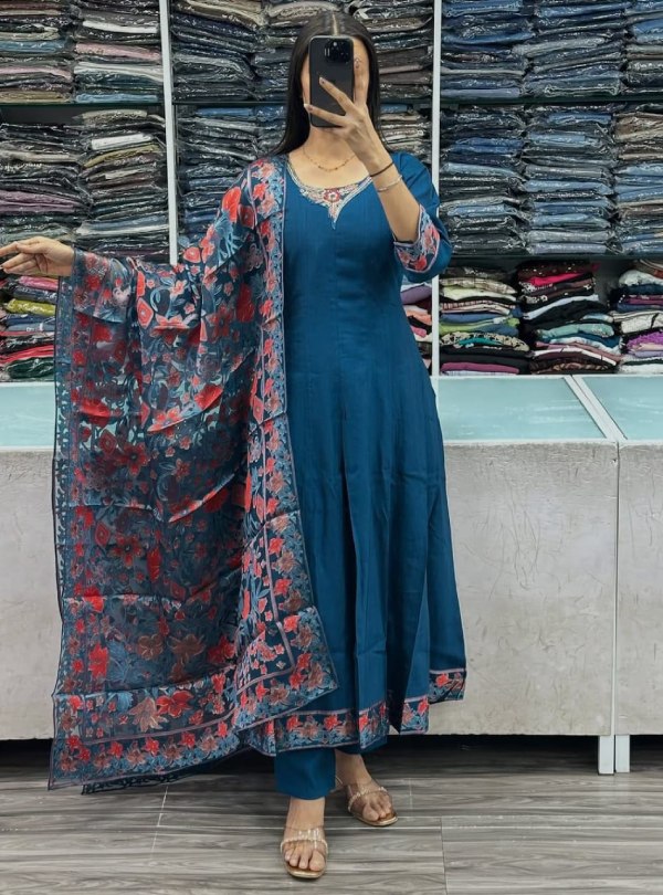 Turn heads as you glide in this dreamy kurta set, designed to make you look like you’ve walked straight out of a dreamy movie scene! With its full flared Anarkali silhouette, exquisite embroidery, and flowing dupatta, this flared Anarkali kurta set is perfect for adding a touch of grace to your traditional wardrobe. Whether you’re drawn to a flare Anarkali suit or love a classic flare Kurti design, this dreamy Anarkali will elevate your festive look effortlessly.