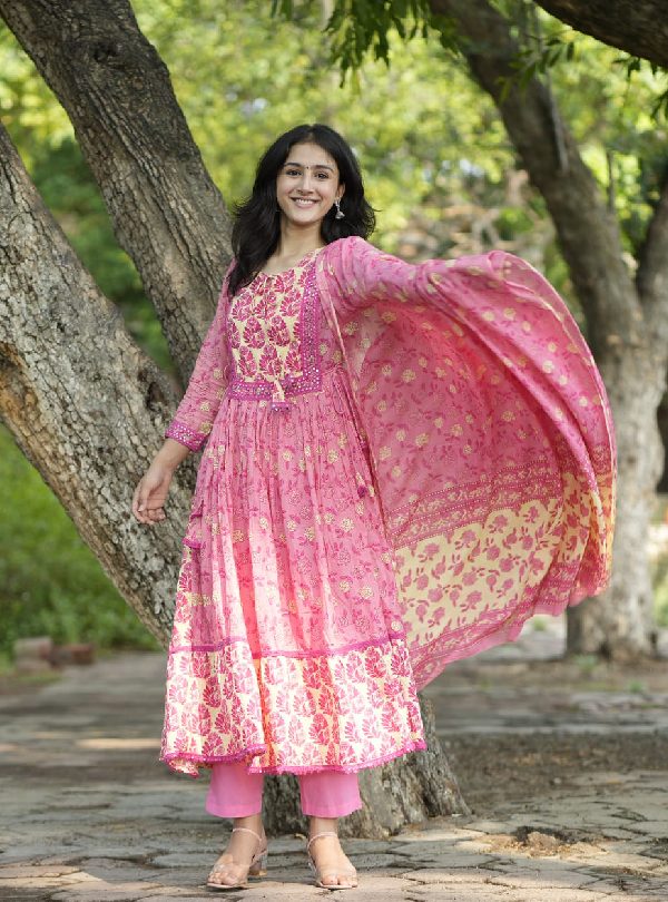 Elevate your ethnic wardrobe with this Floral Embroidered Anarkali Set. Crafted from premium cotton, it features intricate floral embroidery, a comfortable cotton pant, and a matching malmal dupatta. Perfect for weddings, festivals, or casual celebrations